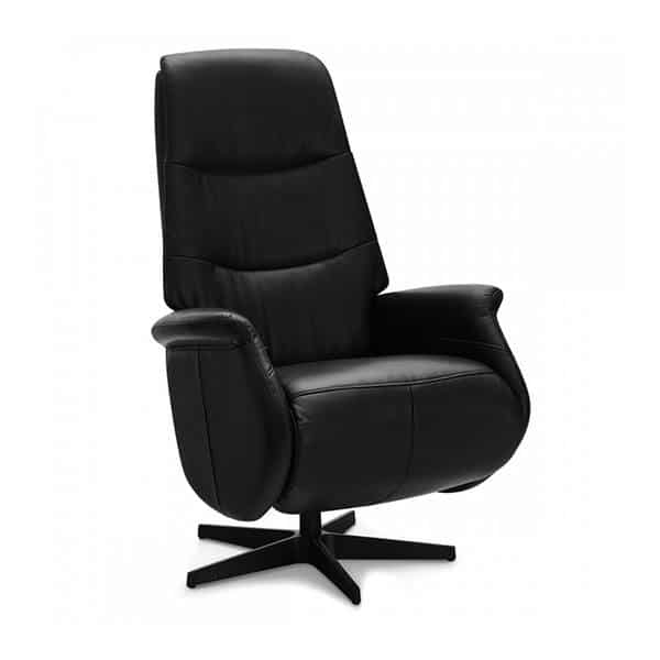 Smuk lænestol med indbygget fodskammel Lækker og komfortabel lænestol med indbygget fodskammel og regulerbar ryg. Stolen har et let udseende med sin smalle ryg og stjernefod i metal. Stolen er med sort læder på alle slidflader, skai læder på ryggen og sor