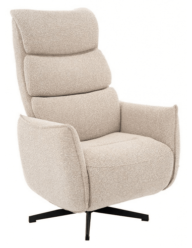 GOTEBORG Lænestol med elektrisk indbygget fodskammel, udført i et design fremstillet i sortlakeret metal og naturfarvet bouclé stof. Stolen måler 118 cm i højden over ryggen og med siddehøjde på 48 cm. Stolens ryg og fodskammel reguleres ved hjælp af betj