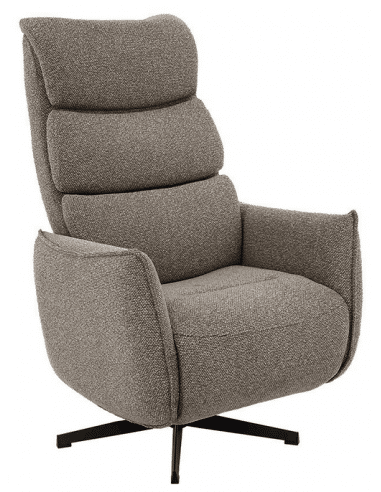 GOTEBORG Lænestol med elektrisk indbygget fodskammel, udført i et design fremstillet i sortlakeret metal og taupefarvet bouclé stof. Stolen måler 118 cm i højden over ryggen og med siddehøjde på 48 cm. Stolens ryg og fodskammel reguleres ved hjælp af betj
