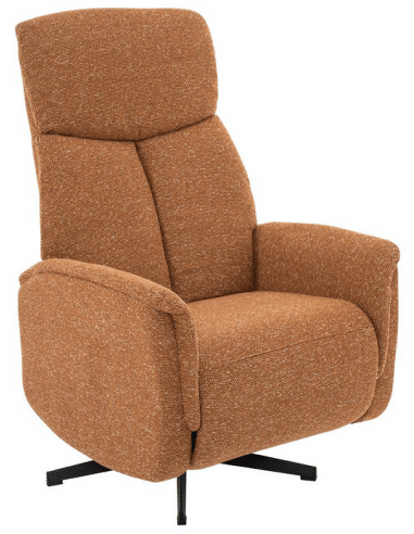 HELSINKI Lænestol med indbygget fodskammel og drejefod, udført i et design fremstillet i sortlakeret metal og koralrød bouclé stof. Stolen måler 114 cm i højden over ryggen og med siddehøjde på 47 cm. Stolens ryg og fodskammel reguleres ved skub mod ryglæ